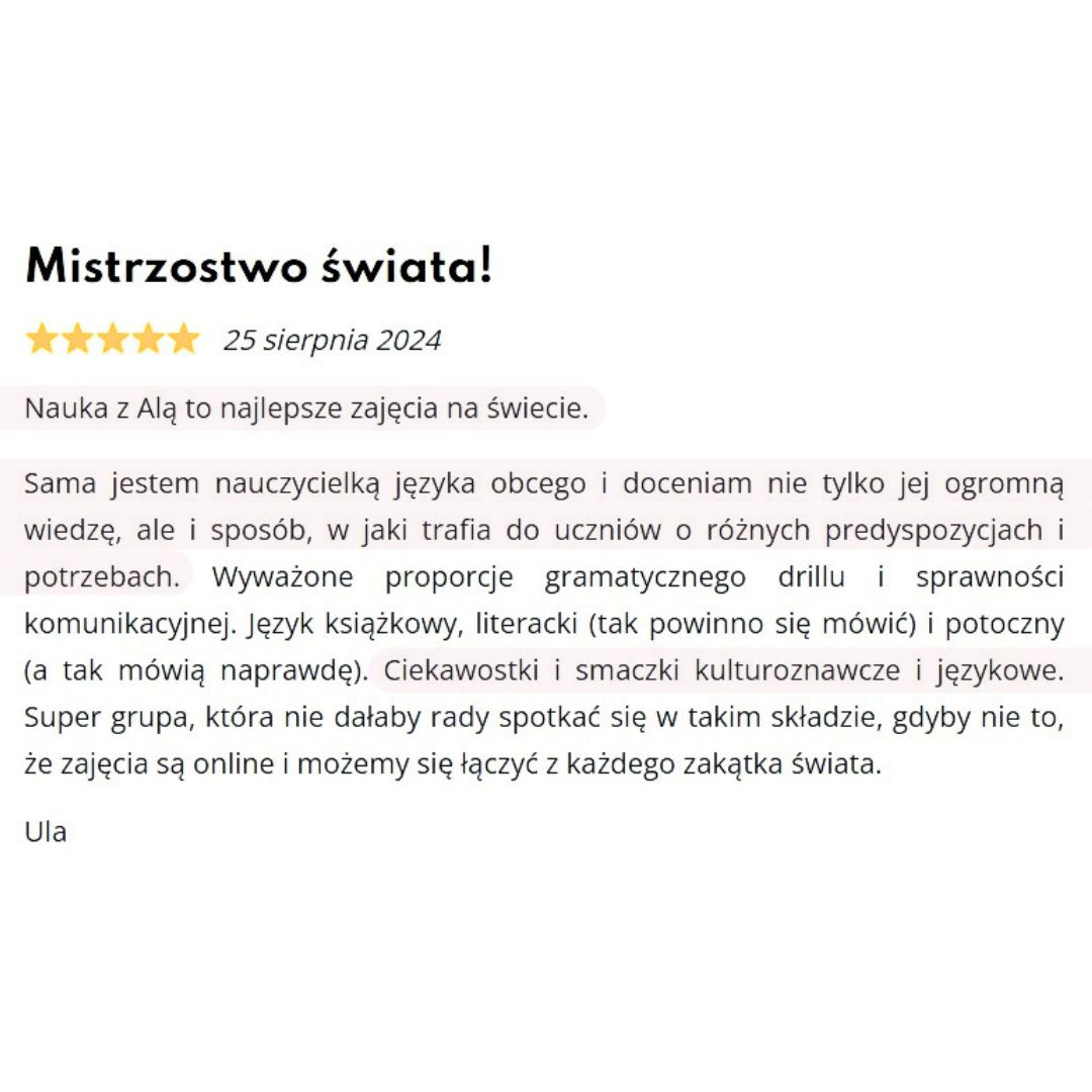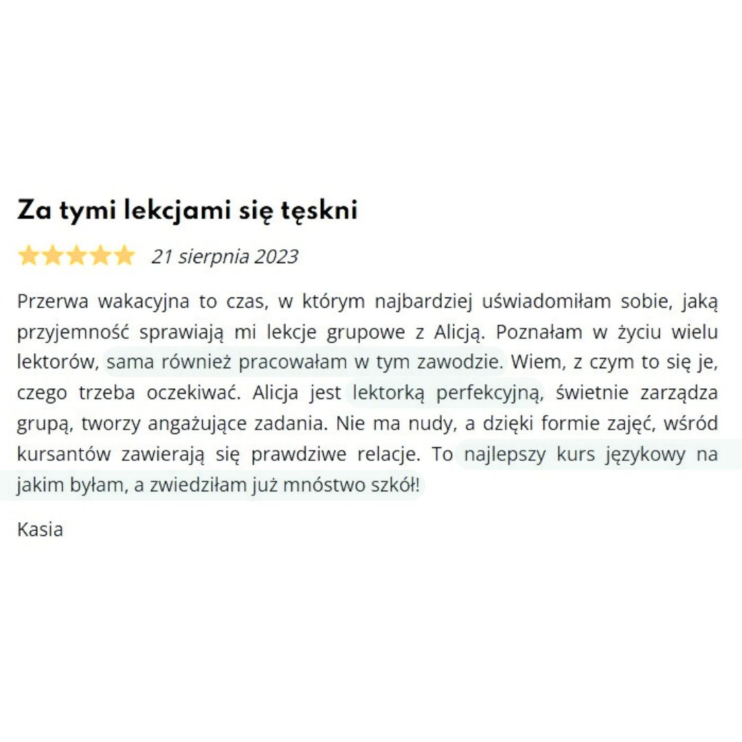 Przeprowadzane podczas kursu testy i zadawane prace domowe, które wymagają sprawdzenia, sprawdzam poza zajęciami. Dzięki temu, po pierwsze, nie tracimy na to czasu podczas lekcji, ale też jestem w stanie do każdego zadania podejść indywidualnie i w spersonalizowany sposób wskazać, nad czym konkretnie dana osoba powinna dodatkowo popracować, ale też pochwalić za to, co jej świetnie wychodzi ;-)